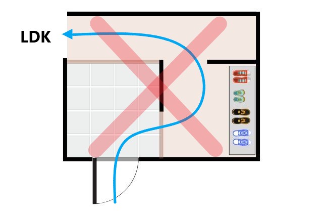 みなさんが通勤や通学のときには、同じ靴を使う場合が多いですよね。そうすると「明日も同じ靴だから玄関に脱ぎっぱなしでいいや!」となります。こうなると、玄関に靴がどんどん増えて、WISCはただの大きな靴箱になってしまいます。ウォークイン型にしておけば、「もっと収納ができたのに。」と後悔するパターンです。ウォークスルー型を生かすためには、動線計画がカギです。
