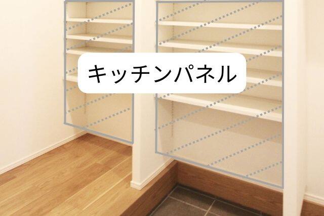 | キッチンパネル | 可動棚の背面壁におすすめです。ビニールクロスや漆喰だと靴があたって汚れたり傷がつきやすいです。 |