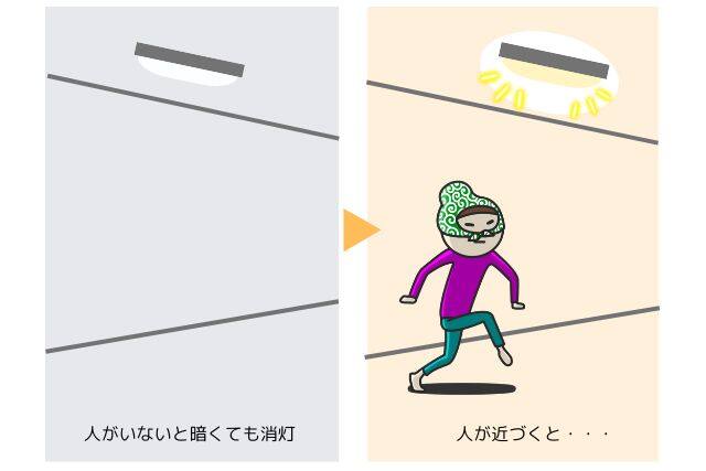 暗くなってくると人を感知して、照明のONとOFFをしてくれる機能です。夜の帰宅時にカギを探すのに便利ですし、防犯対策にもなります。また、お買い物帰りで両手がふさがっているときに便利です。トイレなどでスイッチの消し忘れが多いと思う場所にもおすすめです。待機電力は1か所につき15円/月くらいなので、費用的に大きな負担になることはないでしょう。